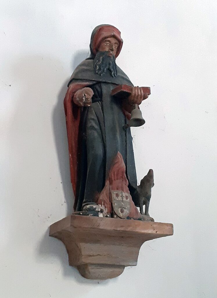 Saint Antoine ermite, en bois de châtaignier, avec son capuchon bien enfoncé et ses attributs (livre ouvert, clochette, cochon, flammes);