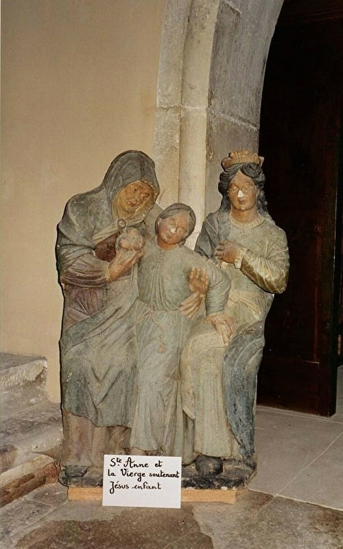 -Statue représentant Marie Salomé et ses deux fils, (XVIIe ) St Jean (calice qu’il tient à la main et sur lequel se dresse un serpent) et St Jacques le Majeur (il tient à la main gauche un bourdon et dans la droite un bâton dont on ne voit plus que l’emplacement, sur