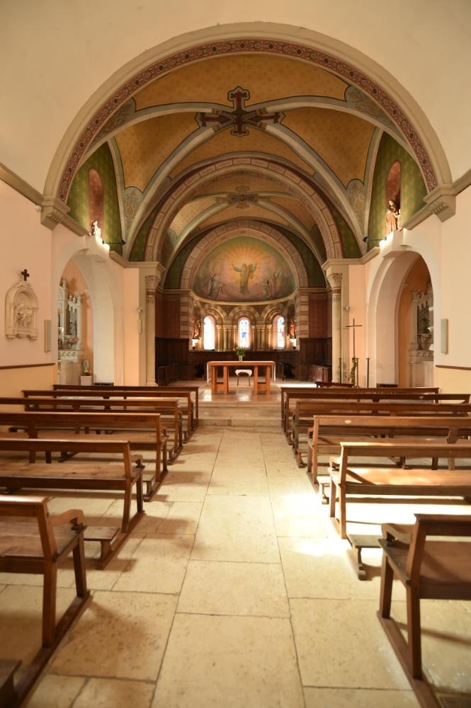 L’intérieur se compose d’une nef unique, dallée, couverte en anse de panier, éclairée par six vitraux, d’un avant-choeur et d’un choeur, en cul de four et de deux chapelles latérales : l’une dédiée à la Vierge Marie, l’autre aux saints patrons de l’église : Saint Cyr et Sainte Julitte. Le choeur et le transept ont été décorés par le peintre mâconnais Victor Bussière en 1901. Cet artiste a aussi décoré plusieurs églises voisines dont Senozan, Hurigny … et, à Mâcon l’Hôtel de Ville.