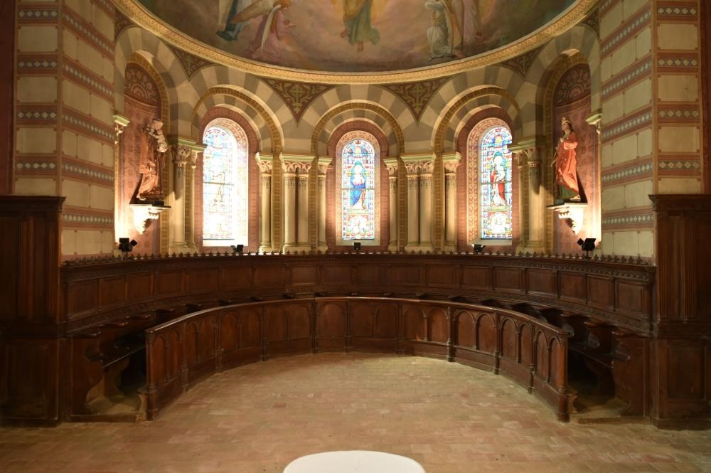 Dans le choeur les vitraux sont divisés en deux parties haute et basse et réalisés par un maître-verrier parisien : à gauche Saint Jean-Baptiste portant l’Agneau mystique au-dessus du Baptême du Christ, remarquer la colombe du Saint Esprit, au centre le Sacré-Coeur au-dessus de l’apparition à Sainte Marguerite-Marie Alacoque à Paray-le-Monial et à droite Saint Joseph, père nourricier de Jésus, tenant la scie de charpentier au-dessus de la mort de Joseph en présence du Christ et de Marie.